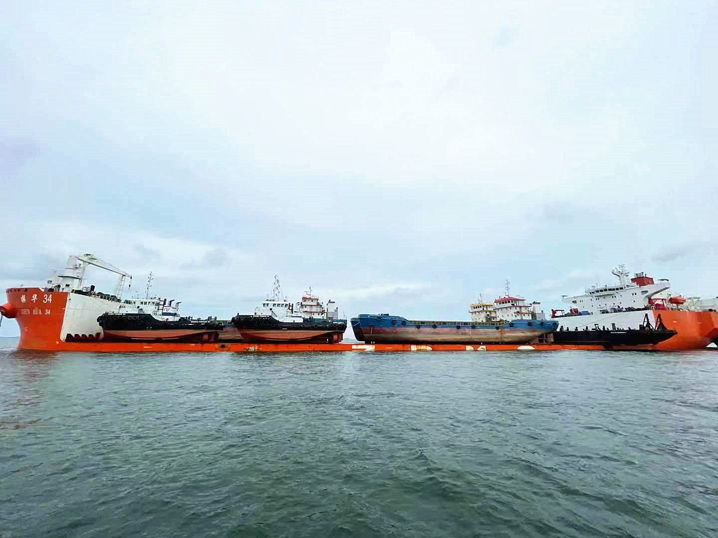 7月4日,“振华34”轮在新加坡成功浮装7艘工程船。