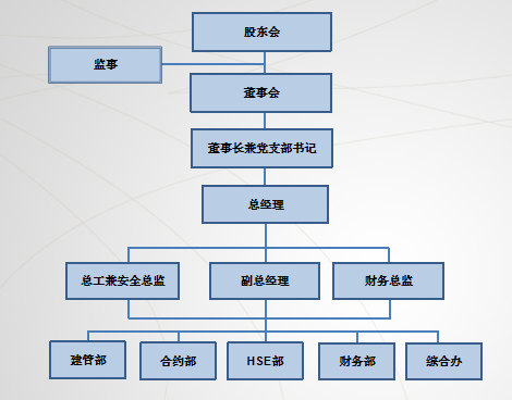 公司设股东会、董事会,另有监事2名。公司管理人员依次为董事长、总经理、副总经理、财务总监、总工兼安全总监,并设“4部一室”。