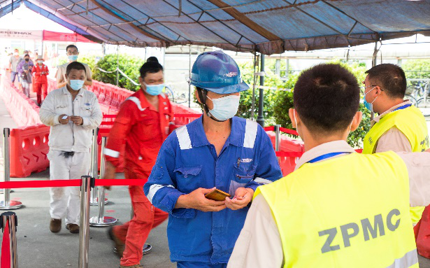 8月10日参加演练的还包括南通振华重型装备近3000名员工,因人员较多,为提高效率,社区组织10组采样人员进驻振华重型装备生活区服务。采样现场,身着中交和振华蓝、黄马甲的志愿者成为一大亮点,他们冒着高温在现场维持秩序,为排队的员工测温,提醒和帮助受检员工截屏行程码、健康码,协助员工进行身份证和电话号码登记,展示了志愿者的良好形象。