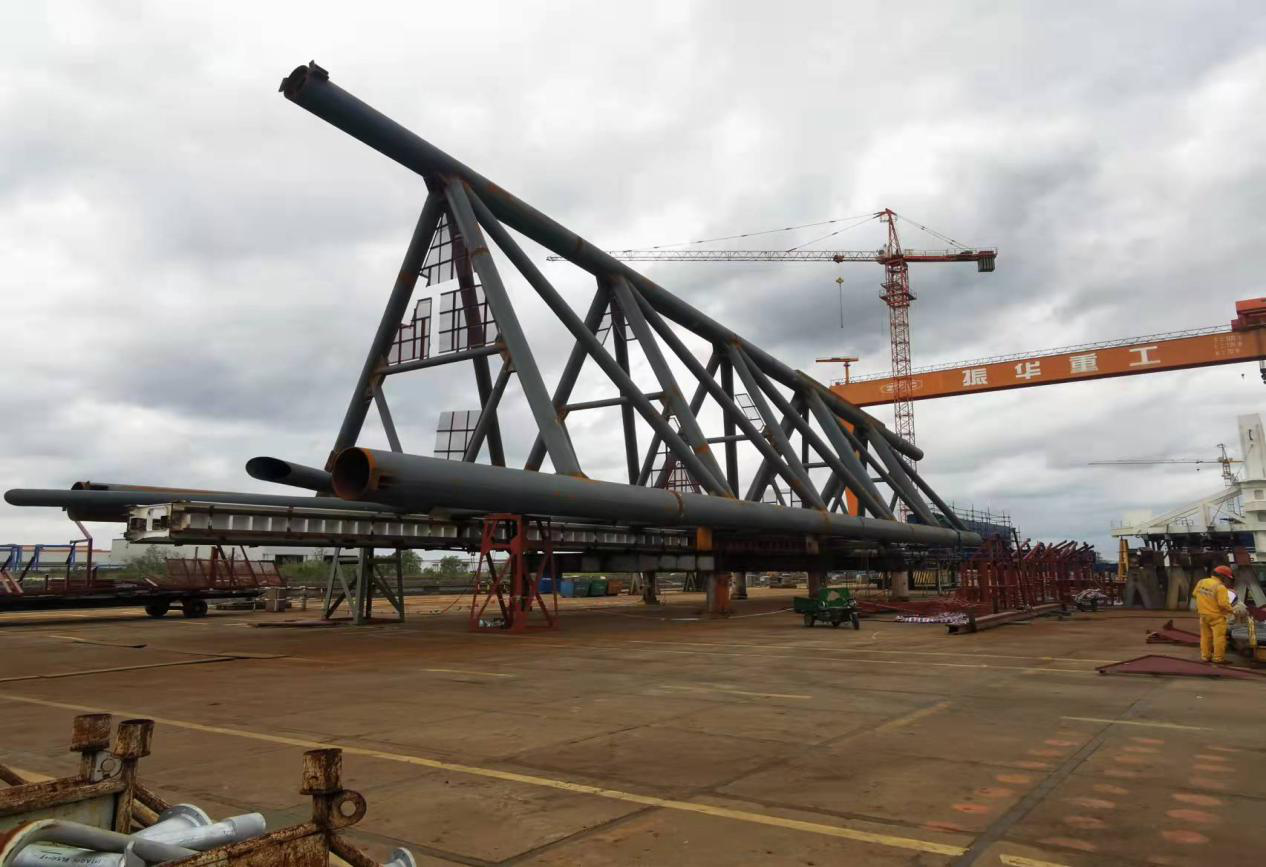 140米级打桩船项目桩架陆续进入坞内合拢总拼