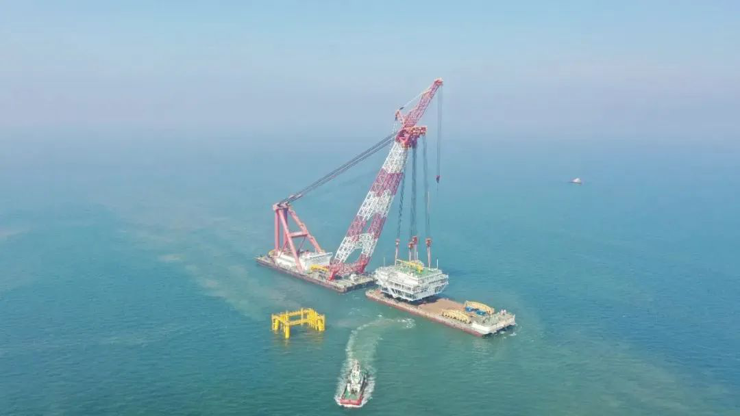 “新振浮7”轮顺利完成山东能源集团渤中海域A场址风电项目海上升压站上部组块吊装任务