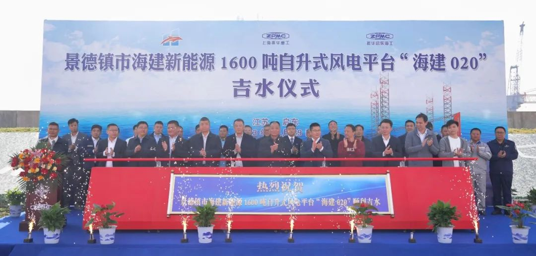 11月29日,振华重工为景德镇市海建新能源工程有限公司建造的1600吨自升式海上风电安装平台“海建020”项目在启东顺利举行吉水仪式。
