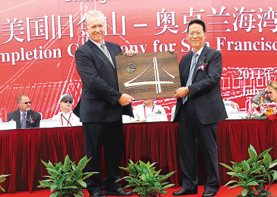 7月11日,由上海振华重工(集团)建造的美国旧金山-奥克兰海湾大桥全部钢结构在上海长兴岛成功交付。新海湾大桥是世界第一大单塔自锚抗震悬索钢结构桥梁,是世界桥梁通过能力之首。振华重工承建的是新海湾大桥的钢桥、钢塔、浮吊等,总标的额超过3.5亿美元。